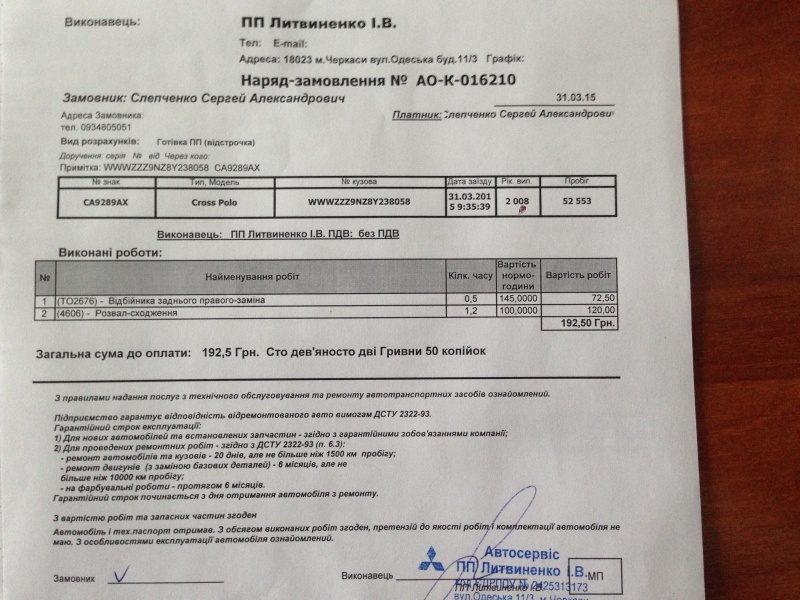 | Агрегат (работа): | Регулировка углов установки колес (развал-схождение) | |