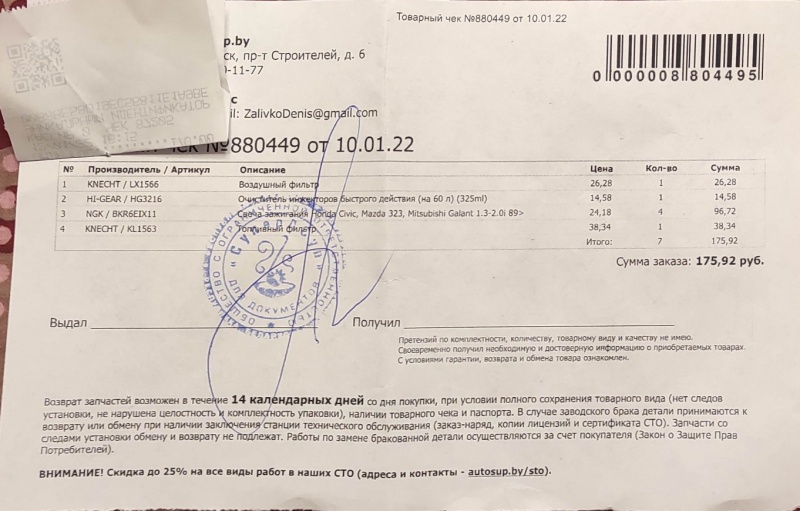 | Общая стоимость: | 191.34 BYN | |