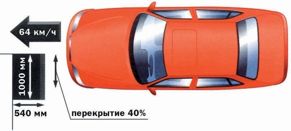 Фронтальный краш-тест: 64 км/ч, перекрытие — 40%, деформируемый барьер. Максимальный балл — 16