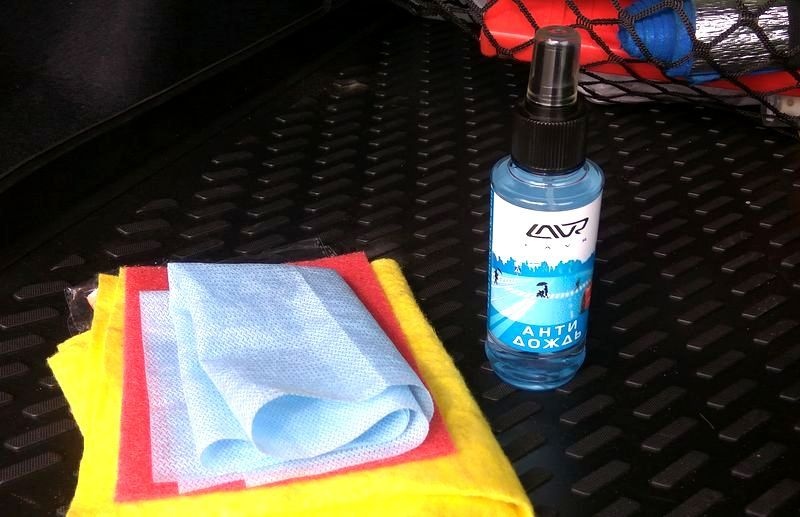 Решив подходить к проблеме комплексно, для усиления положительного эффекта, мной было приобретено средство с говорящим названием – «Анти дождь». В двух словах это вещество, создающее на поверхности стекла гидрофобную пленку. По задумке производителей, после обработки поверхности данным средством, капли дождя должны скатываться со стекол не оставляя следа. На практике же результат оказался не таким однозначным.