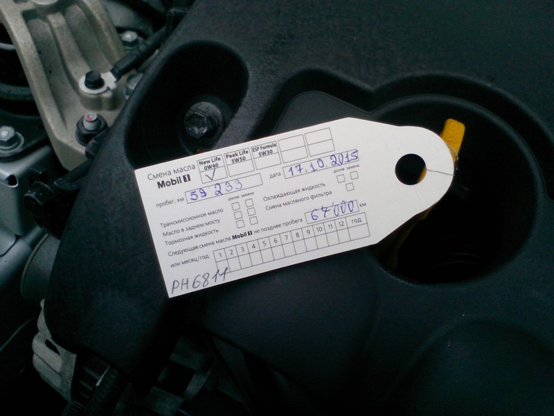Меняю масло в ДВС каждые 7-8 тыс. км. С учётом моего ежемесячного пробега, получается замена раз в год, примерно в октябре - ноябре. Очередная замена произошла 17 октября 2015 года. Было куплено и залито масло моторное синтетическое Mobil 1 New Life 0w40