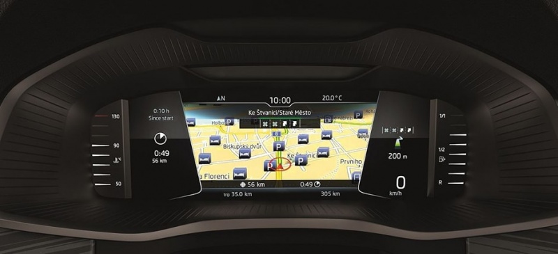 Цифровая панель удобна тем, что водитель может самостоятельно настраивать положение приборов и размеры блоков под свои предпочтения. Так, чешский производитель предлагает целых четыре базовых шаблона, в которых центральное место отводится навигационному комплексу. Оставшееся свободное пространство можно заполнить привычными показателями скорости, тахометра, количества топлива в баке и другими данными. Исключение составляет минималистичный дизайн, в котором экран делится на два крупных блока с ключевыми данными. Однако и этот вариант подразумевает визуальные подсказки маршрута при активированном навигаторе.