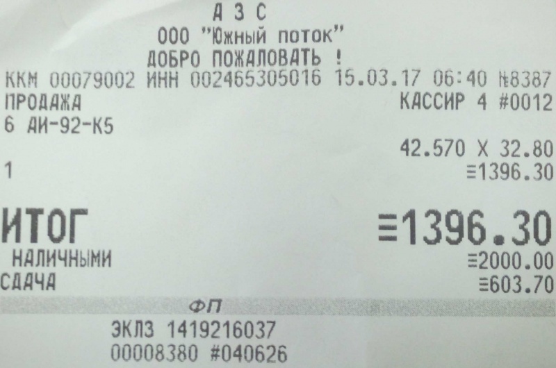 Заправка Бензин (AИ-92) (ООО "Южный поток" Бирюса)