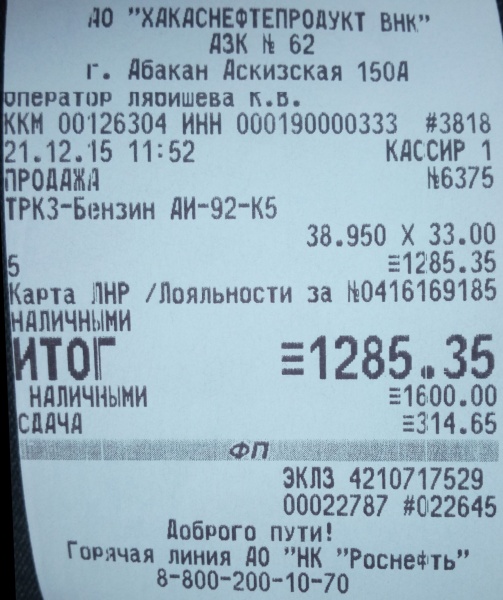 Заправка Бензин (AИ-92) (Роснефть)