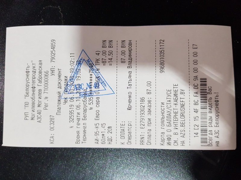 Заправка Бензин (AИ-95) (Беларуснефть №6)